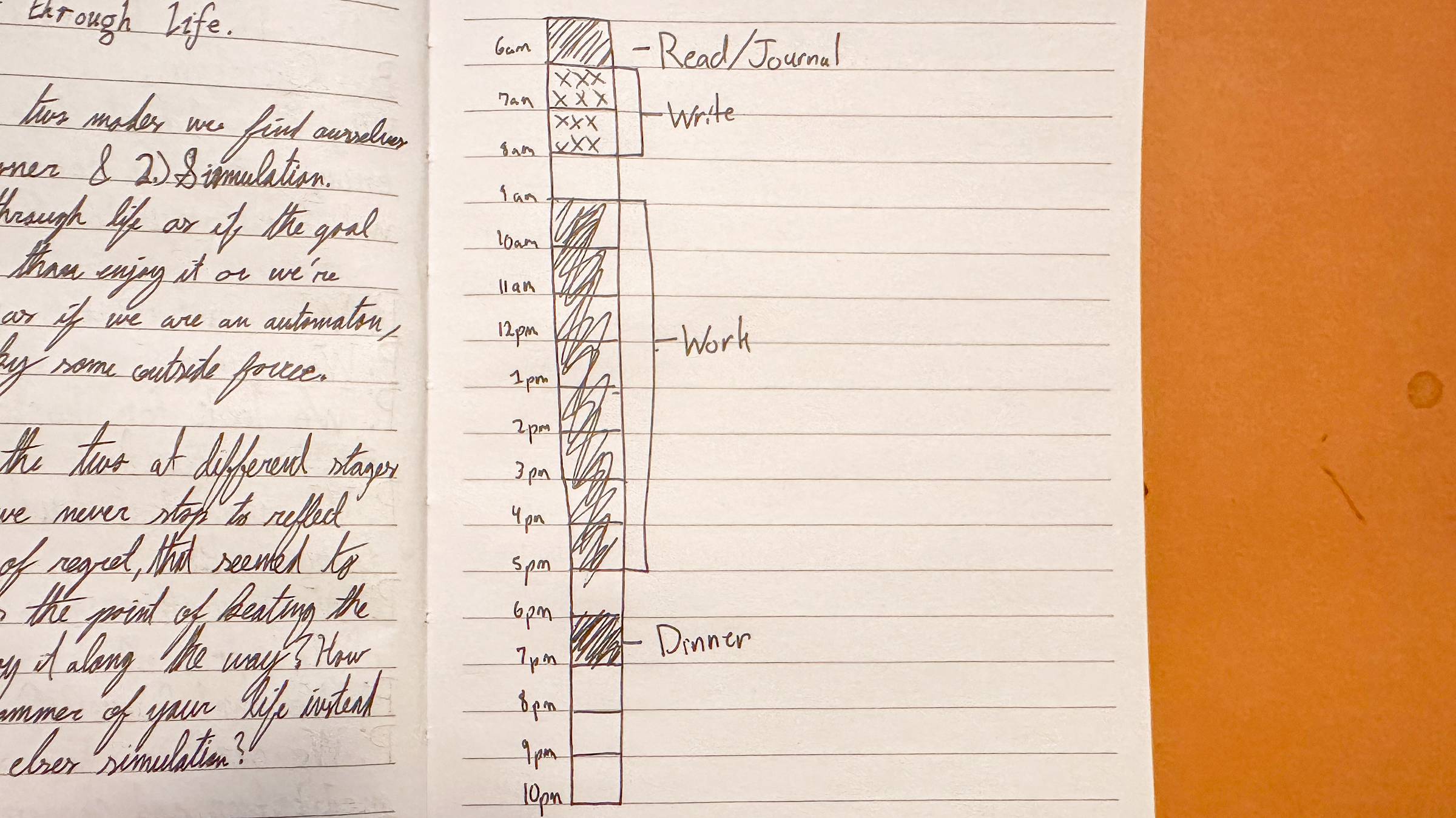 And because they give it away, it feels like life happened and they weren't there to experience it. The speedrunners give up the present in exchange for the future, a gamble that doesn't always pay off. To them, solitude and time spent journaling would be seen as a massive waste of time, the act of handwriting in a notebook unbearably inefficient. Why not just listen to audiobooks at 3x speed, voice dictate your thoughts into your phone, and have AI summarize how you're feeling? Surely that's the key to reclaiming your time, right? In Stillness is the Key Ryan Holiday wrote, "(Journaling) is a few minutes of reflection that both demands and creates stillness. It's a break from the world. A framework for the day ahead. A coping mechanism for troubles of the hours just past. A revving up of your creative juices, for relaxing and clearing." Journaling by hand, in a physical notebook, slows us down and creates the space required to be intentional with our lives, present in the moment, and focused on the right things, right now. Method 1: Get Organized - Time-BoxingMost people aren't aware of where all their time is actually going and this allows them to confidently proclaim that they don't have any to spare. But the data on phone usage tells a different story. On average, people spend about 4 hours and 37 minutes on their phones each day, which is the equivalent of 70 days a year. It's no wonder people feel like life is passing them by–they're spending two months a year staring into a phone screen, not to mention the other screens we're so fond of being entertained by. Clearly, it's not time that is lacking. (I'm aware of the irony that I'm sharing the dangers of screen use with you through a screen, but I genuinely care about this problem. The lives of so many people I know would be exponentially improved if they just found other uses of their time rather than rely on their phones as constant companions to relieve them of discomfort.) Now, in my hunt for the perfect system, I did come across one technique that's incredibly effective at getting a grasp on your allocation of attention. It's a technique called time-boxing or time-blocking. Get out a piece of paper, or your notebook. (technically you can use a calendar app but come on...just try analog for a minute)