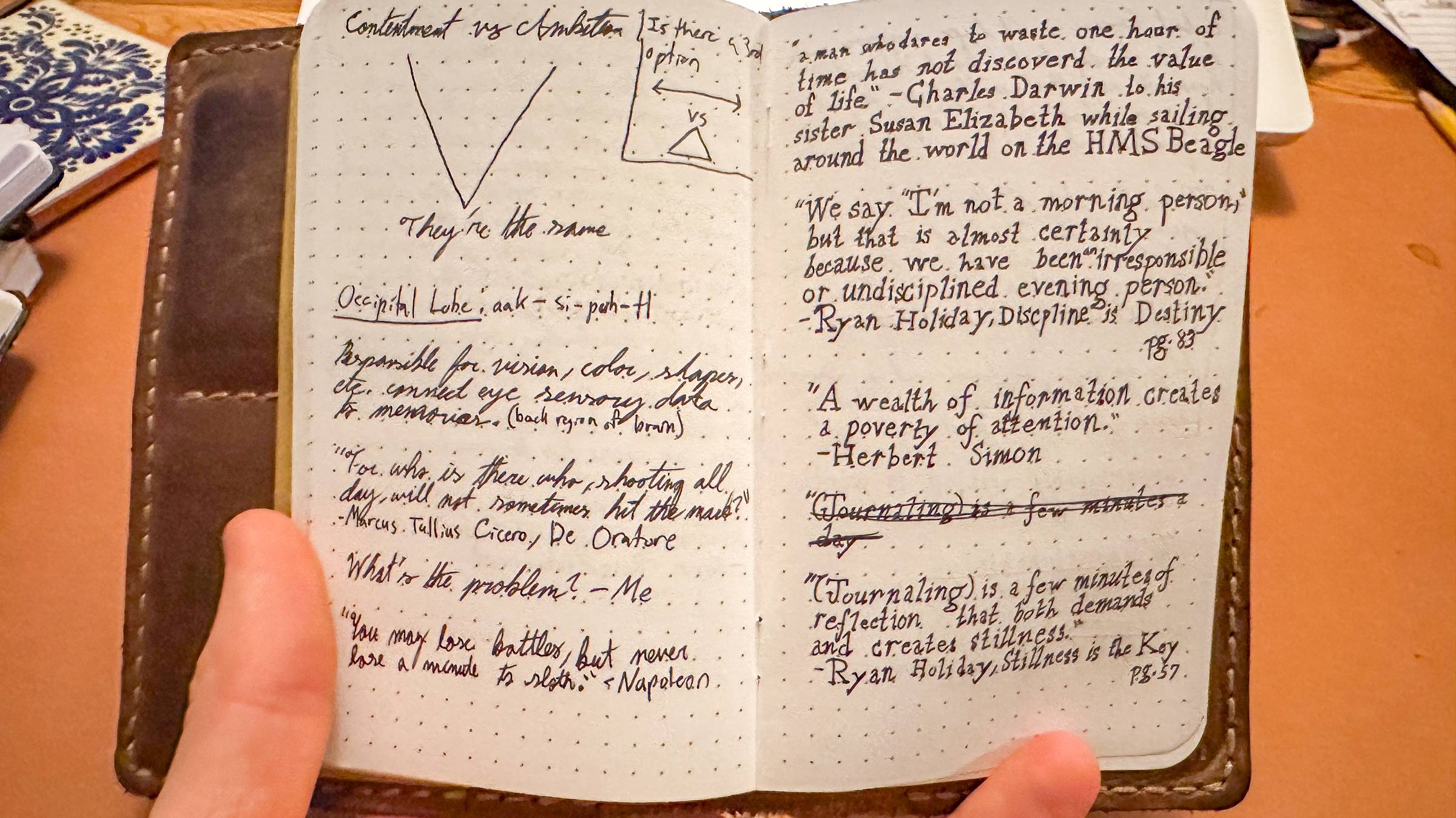 The promise of technology is to reduce the friction so low that we never have to struggle again. So, I filled every second of my time with activity to prove I wasn't a Sim anymore, never pausing to think about where it was all leading. A spare minute here would be spent optimizing my systems, and a spare minute there learning how to use the next piece of software that promised me I'd get my time back. Napoleon once said, "You may lose battles but never lose a minute to sloth." If I just stayed busy all the time, surely I would win the war on my time. Of course, this was just shifting the problem. Instead of giving all my focus and attention away to social media, I was now sacrificing it at the altar of productivity. Time felt like it was flying by even faster, the very thing I was trying to avoid. But things changed when I decided to stop in a bookstore for a few minutes before clocking into work. While looking around, a leatherbound notebook caught my eye and I thought to myself, "Who even has time to write in a journal?!" But if I didn't have the time now, when would I? Was it only future me who could spare 30 minutes to reflect on his thoughts or would I be filling every second of my day with activity for the rest of my life? Actually, why am I so busy? What am I rushing toward? And why do I feel like I have less time than ever? I bought that notebook and it sat on my desk untouched for months–I still wasn't convinced I had time for it. A much needed vacation finally gave me the space to write in it. After one journaling session, I realized the answer I was seeking: to slow down time, I had to slow down. You can't think if you never stop and...think.I once heard author Cal Newport describe solitude as "freedom from inputs from other minds." Solitude is what is missing from most people's lives that would immediately save them from countless hours of wasted time. The Sims of the world freely give away their mental real estate to everyone else: