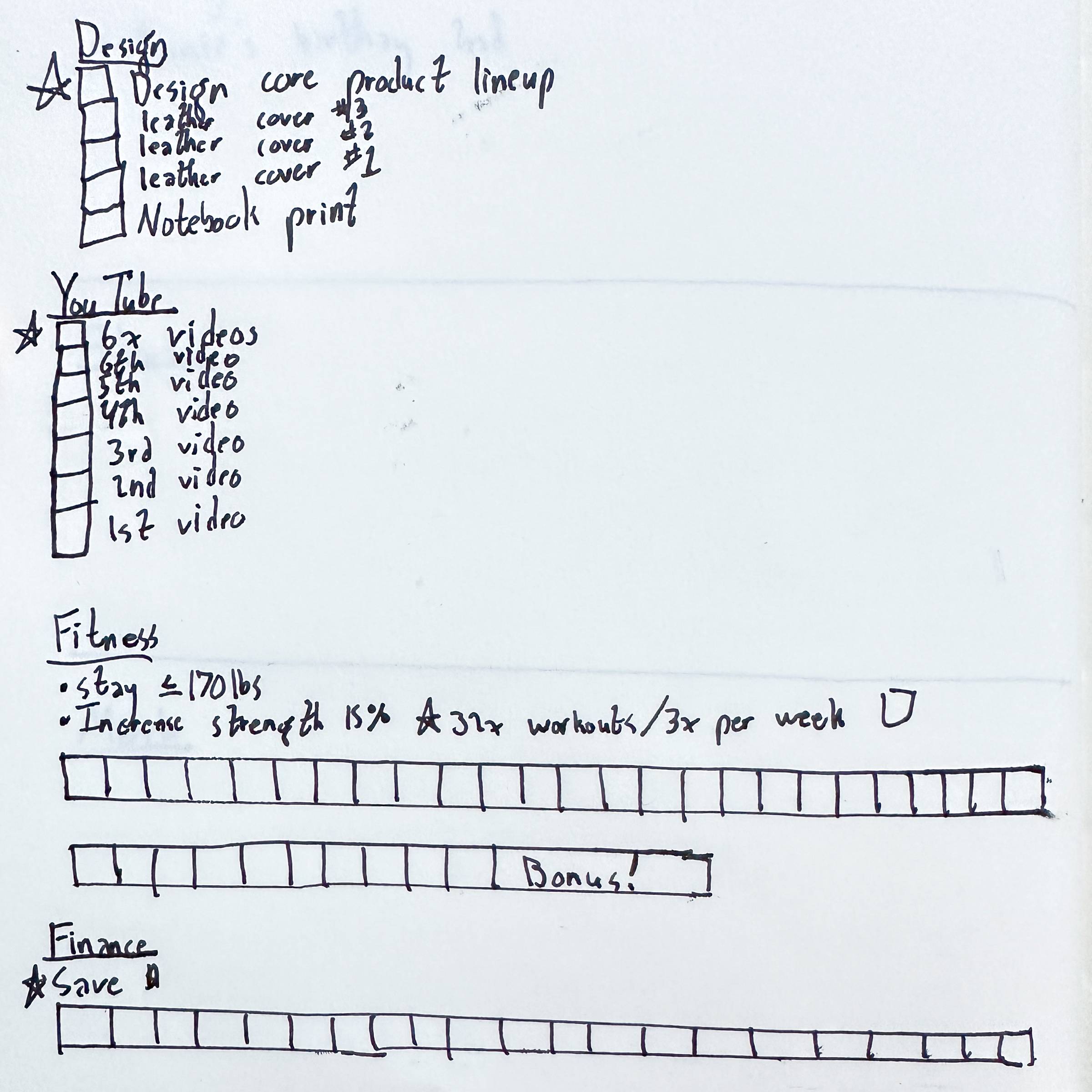 Because writing down your goals can't help you if you tuck that piece of paper in a drawer never to be seen again. You want to revisit those goals, remind yourself of why they're important to you, and monitor your progress towards them so you can make adjustments along the way. You might have noticed I have a fitness goal to lift weights 3x a week. That means by the end of the year I should have around 36 workouts total. I can break that down in 36 sections in my progress bar and each time I complete a workout, I can see that bar fill up. Some weeks I'll drag and only complete 1x workout, and others I might feel inspired to do 5x workouts. But no single week really matters because the goal is to average out to 36 by the end of the year. Almost any goal you have can be broken down into something more measurable and tangible. Spend the extra 5 minutes figuring out what that looks like and try creating a progress bar to log your efforts in real time. This is has been my go-to strategy for the last year and it's been incredibly helpful for my motivation levels. Ok, I've said enough. Write down your goals, create a visual tracking system, and get after it. I can't wait to hear some of your success stories! Prompt: What do you want to achieve by the end of the year? |